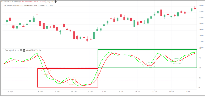 See this image. It is 5,3,3 Stochastics. When Stochastic indicator is at upper range – it shows that recent price is at the upper range of last 5 candles. If stochastic indicator is at lower range – it shows that recent price is at lower range of last 5 candles.
